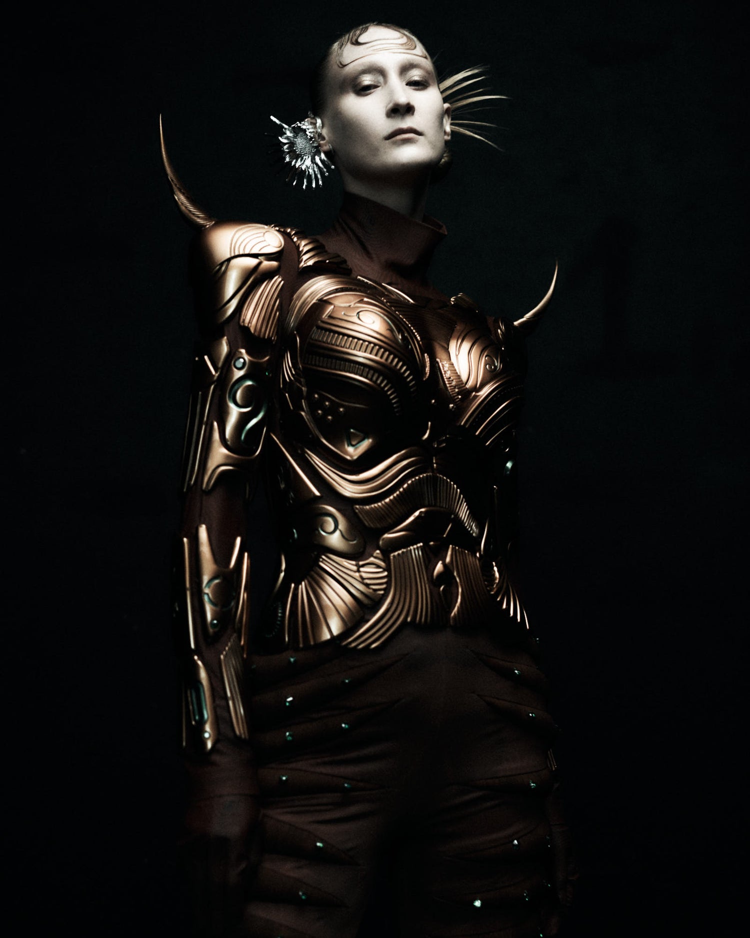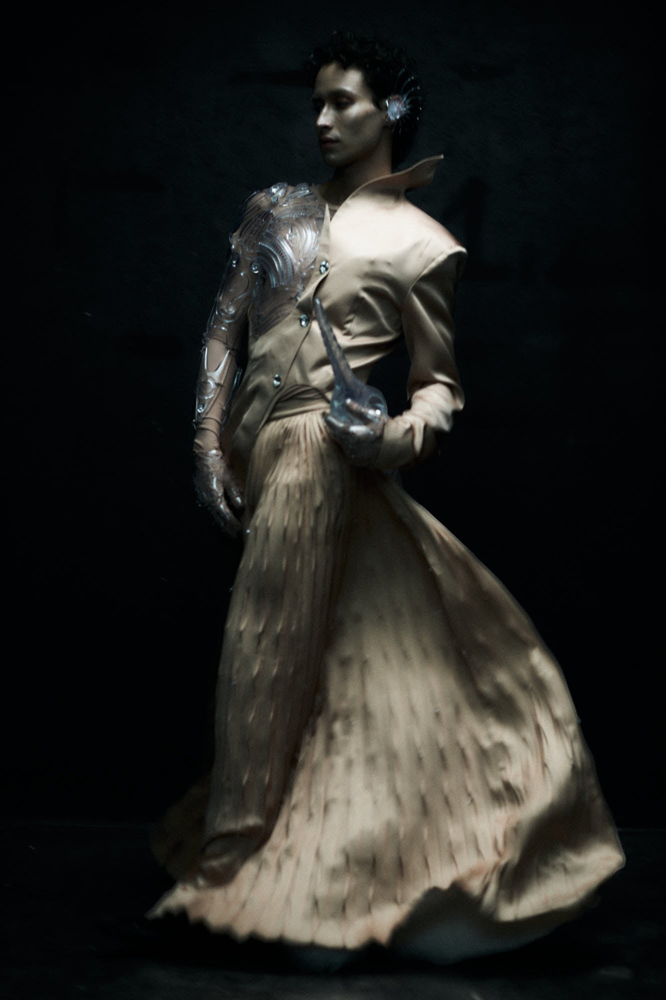 HENGDI WANG bespoke celebrates the body as an expanded organic form — merging sacred geometry, bio-mechanical structure, and hybrid textile technologies.