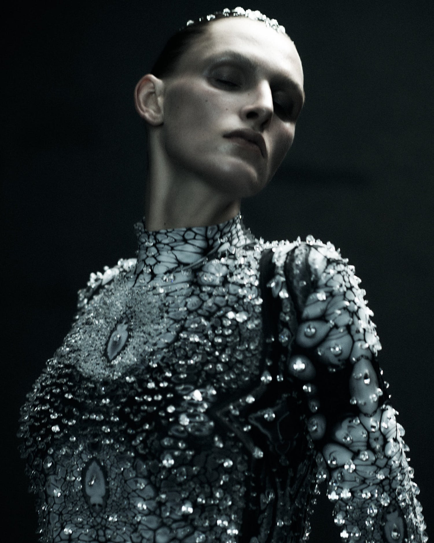 We integrate 3D-printed textiles, metals, and digitally configured fibers that encode celestial maps, translating scales, mechanical modules, and organic structures into future wearables.